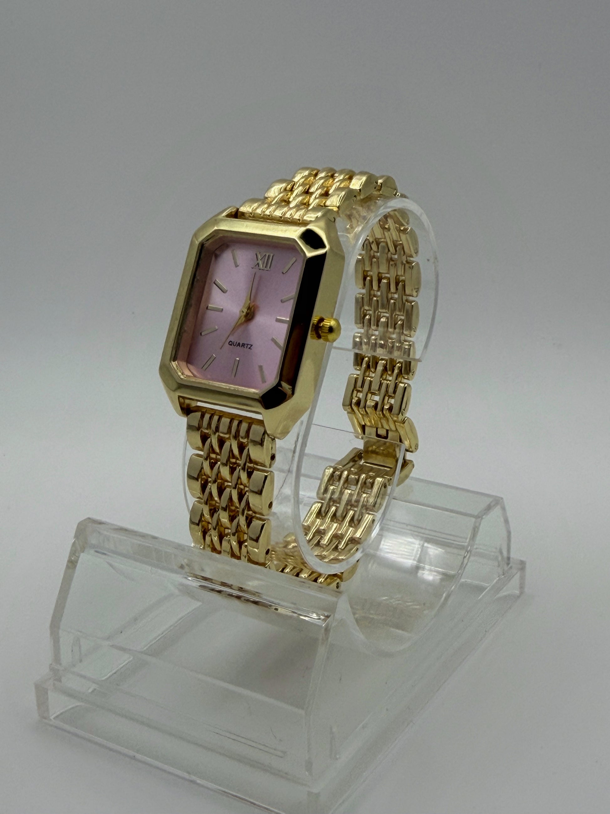 Su esfera cuadrada en tono rosa aporta un aire moderno y distintivo, mientras que su correa metálica dorada, ajustable, garantiza comodidad y estilo tanto en el día a día como en ocasiones especiales.
